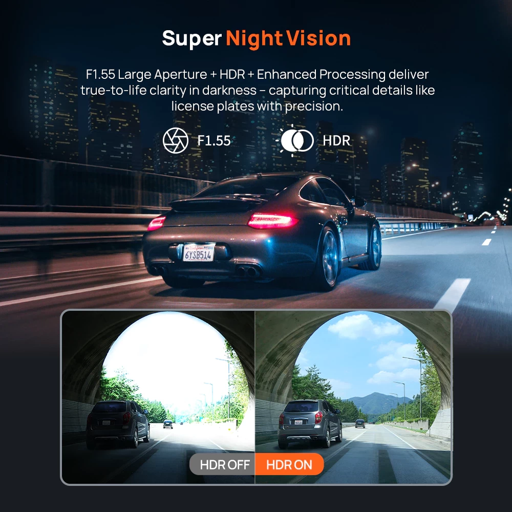 The F1.55 large lens and HDR technology brighten dark roads and parking lots, reducing glare and noise for sharp night videos.