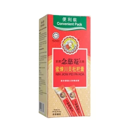 Nin Jiom Pei Pa Koa is a Chinese herbal remedy renowned worldwide to relieve cough, reduce phlegm, soothe sore throat and restore voice loss. Made from 15 natural herbs in Hong Kong under international GMP quality standards, it contains chuan pei to dissolve phlegm and relieve cough, and pi pa ye (loquat leaf) to clear body of heatiness and suppress cough. It can be taken daily. Nin Jiom Pei Pa Koa originated more than a century ago during the Qing dynasty. Available in more than 20 countries including the USA, it has been trusted by generations and continues to be a top brand because of its effectiveness and pleasant taste. The Convenient Pack has 10 liquid sachets; just tear, squeeze and drink. Perfect for travel or daily convenience Place of Origin Hong Kong Product Usage Swallow the syrup slowly for quick relieve or mix with some warm water and drink Ingredients Bulbus Fritillariae Cirrhosae, Folium Eriobotryae, Radix Adenophorae, Poria, Exocarpium, Citri Grandis, Radix Platycodonis, Rhizoma Pinelliae Preparatum, Fructus Schisandrae Chinensis, Semen Trichosanthis, Flos Farfarae, Radix Polygalae, Semen Armeniacae Amarum, Rhizoma Zingiberis Recens, Radix Glycyrrhizae, Mentholum, Mel Width 60 Depth 57