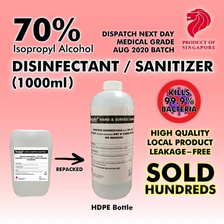 --- Hand Sanitizer 70% Isopropyl Alcohol Based (Hospital Grade) --- Sizes Available- -5Litres (Final few batches!) -1Litres (Directly from 25litres drum, not diluted from concentrate) NO sticky residues unlike other foamy types of hand sanitizer. Direction of usage: - Simply transfer it into a spray container. 100% safe to use on skin & also be used on surfaces eg. Tables, Trolley handles, toilet seats, in ear thermometer capping and oral thermometer. --DELIVERY-- Eligibility for NEXT DAY DELIVERY Daily cut off timing for all orders will be 11AM Monday to Friday. DAY AFTER Delivery will be after the cut off timing 11AM, Monday to Thursday. **IMPORTANT** Please note that: *Maximum of only 2x5L order as J&T is rejecting my parcels of more than 3xL. - Orders made on Friday & Saturday AFTER 11 AM, will ONLY be sent on Monday as J&T Express do not work on SUNDAY. - Orders made on Sunday will be delivered on Tuesday. Purchase with confidence, your satisfaction is our priority! ***FAQ*** 1) Is this skin safe? - Yes, 100% safe. *Please do patch test for allergy* 2) Is this effective against current pandemic? - Yes, as an Alcohol Based Sanitizer (Better than non-Alcohol). However, using soap and water is the best if you have access to it. 3) Do I have to mix with water to use? I wish to mix in some emollient as it will be too drying. - No, you do not have to mix water as it is already pre mixed in the factory accurately at 70% ALC (STABLE) content. Further dilution will weaken the ALC content. You may mix in 3-5ML of emollient (Moisturisers) for every 1000ML part in order not to bring it down less than 65% ALC. 4) What is the expiry date of this? - It has shelf life of 12 months from the manufactured month. If kept in dry and cool places not exposed to sunlight can be stored for easily 24 months. 5) I would like to order more than 8 bottles, will there be a discount? - Any orders than 6, we will deliver to you personally ON the same day if possible. However, a deposit of $50 will have to be paid upfront. Please chat up with us on regarding this. 6) Can I wipe sanitize my oral thermometer before and after use? - Yes! Please do so but remember to dry it!A25
